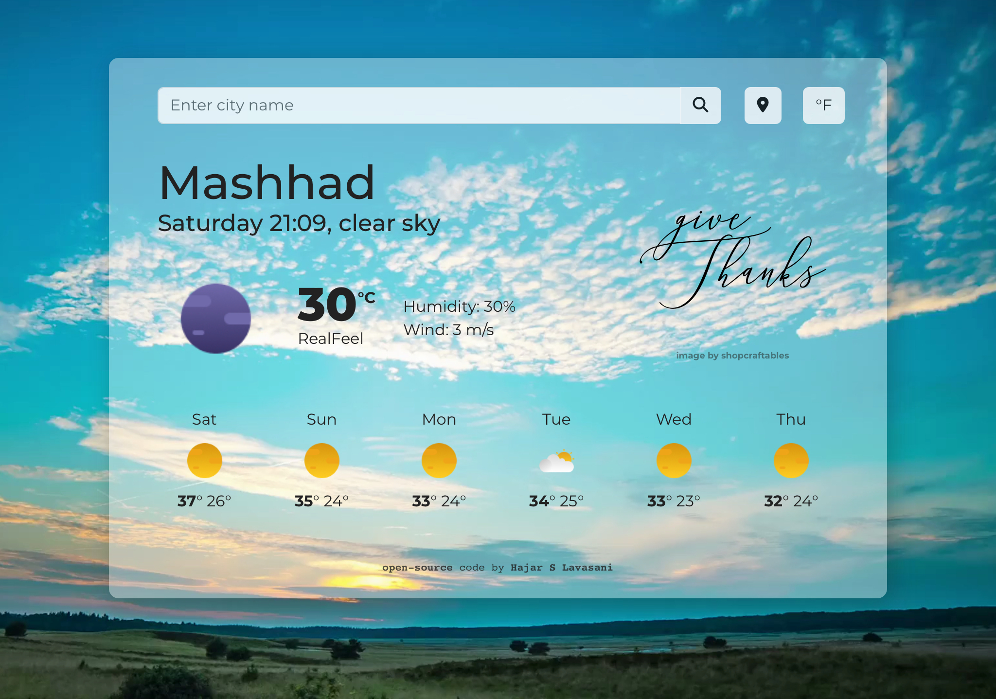 JavaScript weather app shows current feel and five-day forecast in °C or °F; with seasonal video background and motivational quote.